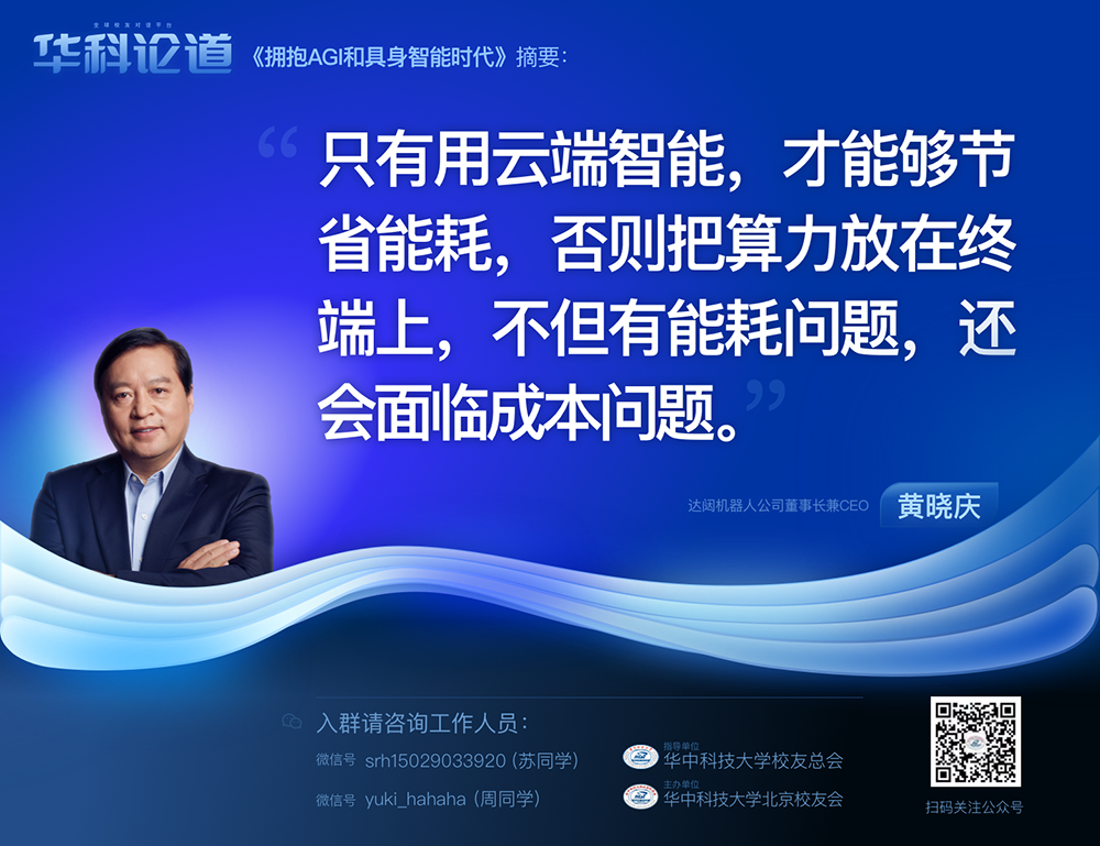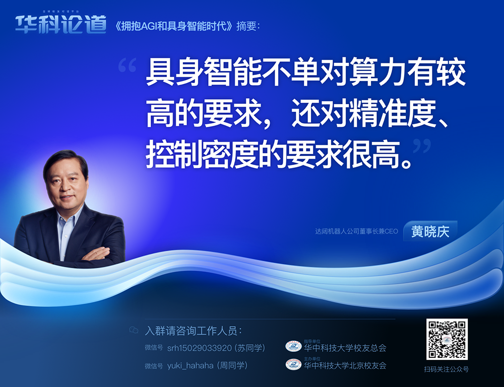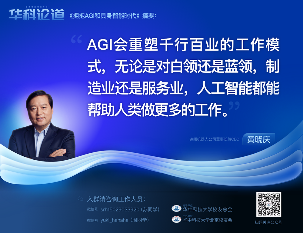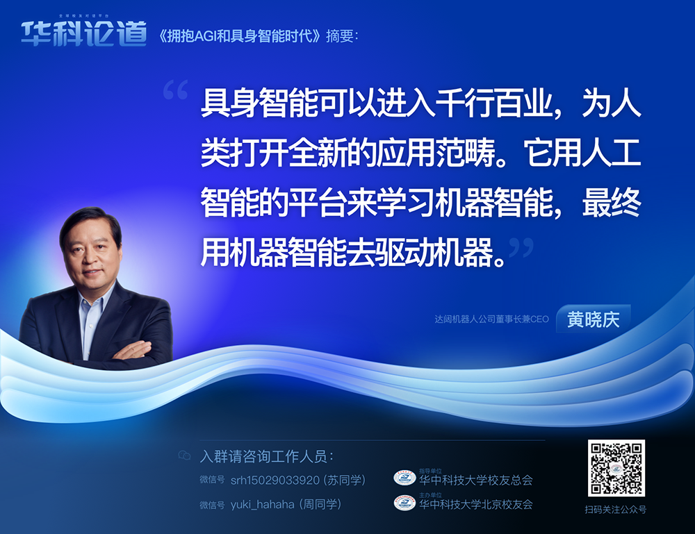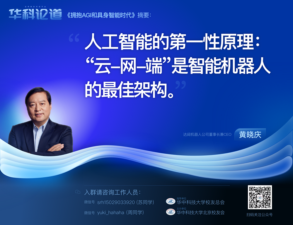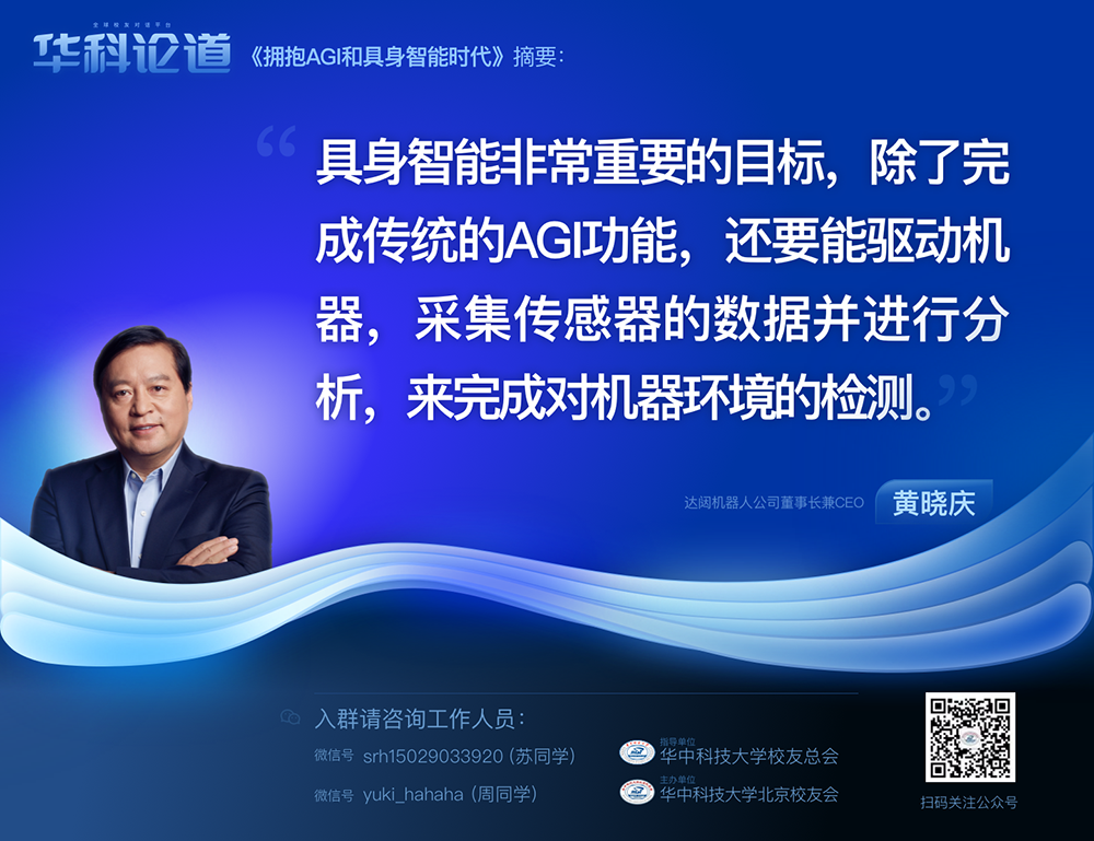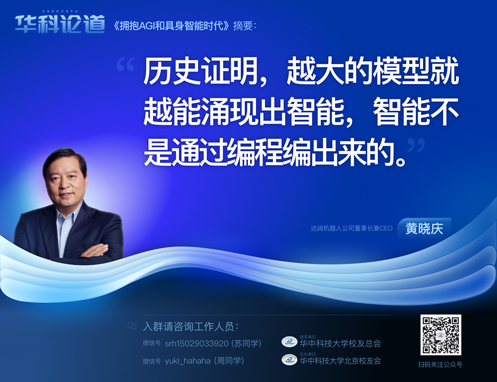 1月30日,在第五十五期“华科论道”上,由华中科技大学北京校友会主办的活动迎来了一位特别嘉宾——365英国机器人公司董事长兼CEO黄晓庆先生,他带来了“拥抱AGI和具身智能时代”的主题演讲,为广大校友带来了精彩纷呈的分享。