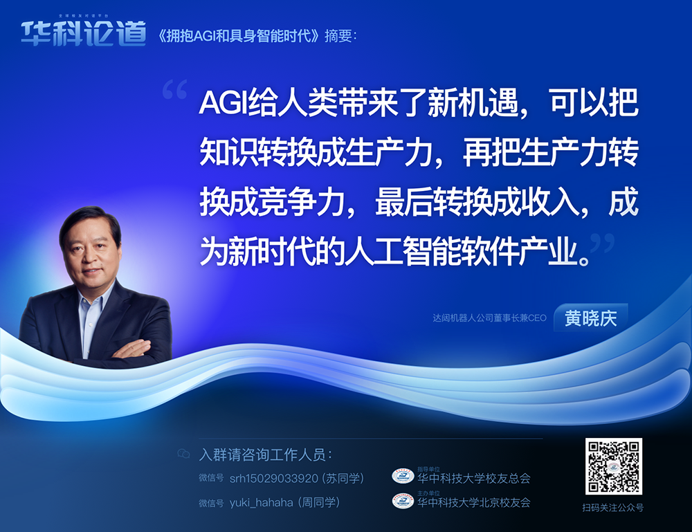 作为华中科技大学杰出校友及全球人工智能领域的前沿技术专家,黄晓庆先生结合自己多年在机器人行业的深入研究和实践经验,分享了对于通用人工智能(AGI)发展趋势及其对各行各业影响的洞见。他认为,AGI将成为新时代软件产业转化知识、生产力、竞争力乃至收入的关键驱动力,以下是他的主要观点和演讲中的“金句”: